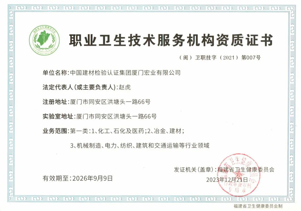 近日,中國建材檢驗認證集團廈門宏業(yè)有限公司(簡稱國檢集團廈門公司)順利通過職業(yè)衛(wèi)生技術服務機構現(xiàn)場評審。福建省衛(wèi)生健康委員會、廈門市衛(wèi)生健康委員會、廈門市衛(wèi)生和計劃生育監(jiān)督所的領導及評審專家們采用“材...